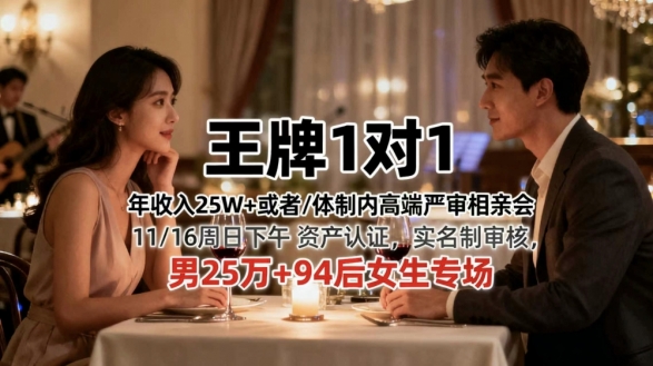 【11/16周日下午王牌1对1】年收入25W+或体制内高端严审相亲会 男25万+94后女生专场